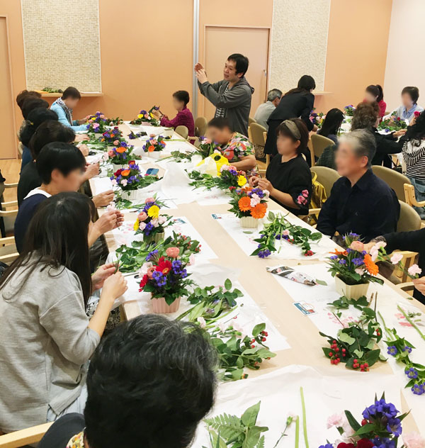フラワーアレンジメント教室は、山田生花店より3名の講師にお越しいただきました。50名を越す参加者で会場が大変華やか&賑やかでした♪男性の参加者も多く、皆様オリジナルのアレンジメントを楽しまれていました