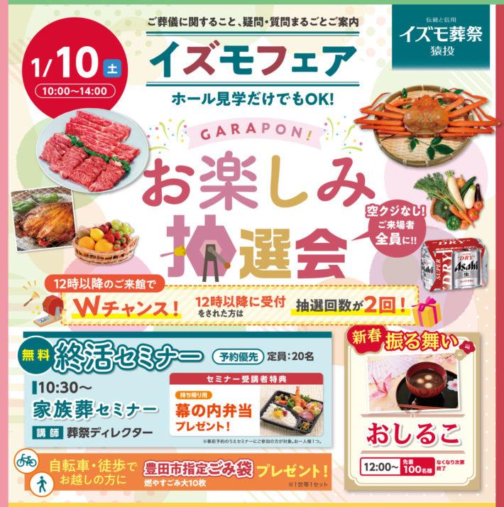 トップ > お知らせ > 1/10(土) イズモ葬祭 猿投 『イズモフェア』開催のご案内