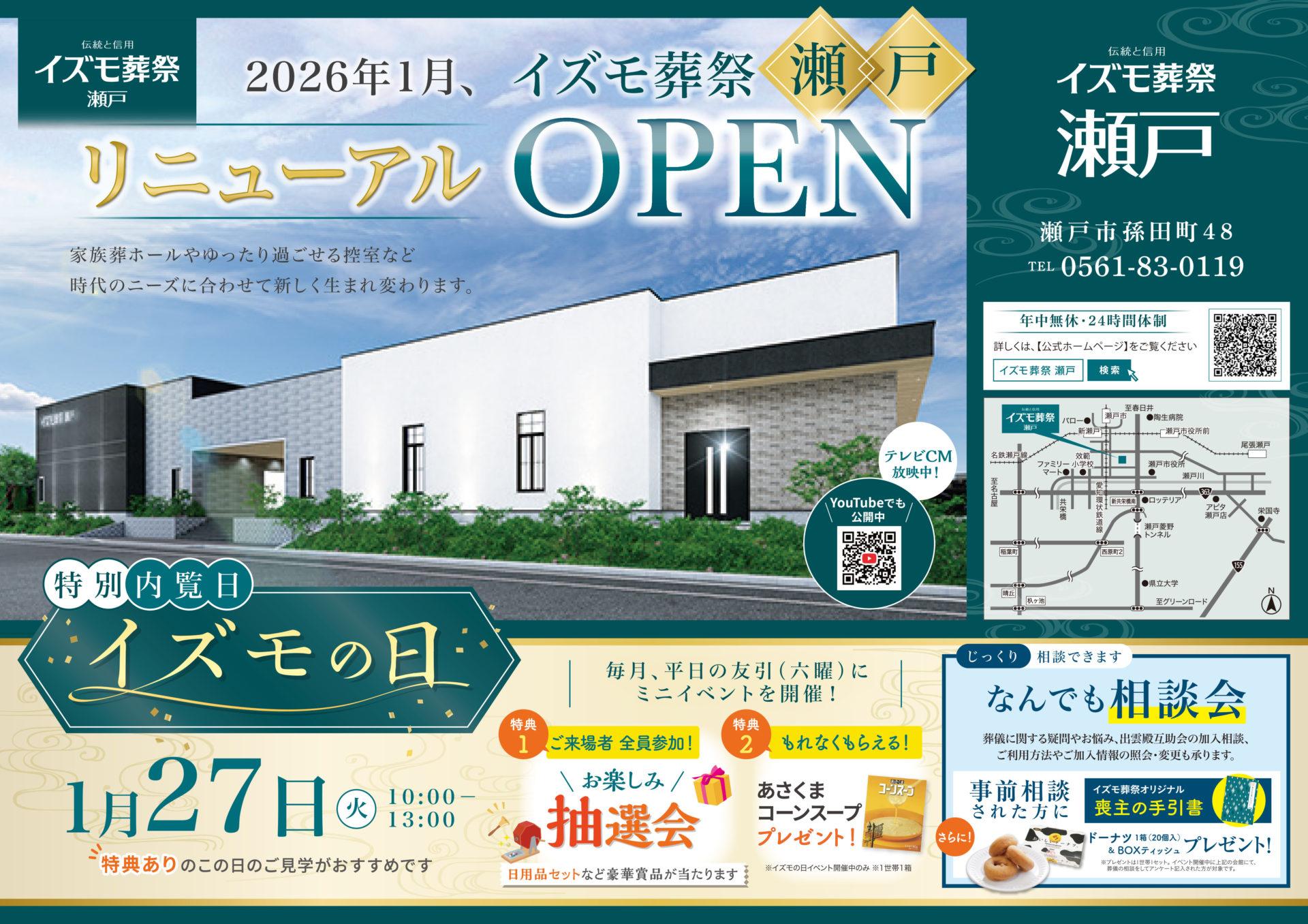 イズモ葬祭 瀬戸は、1月23日(金)に敷地内に新築立て替えでリニューアルオープンいたします。1月27日(火)に初めてのイズモの日ミニイベントを開催いたします。