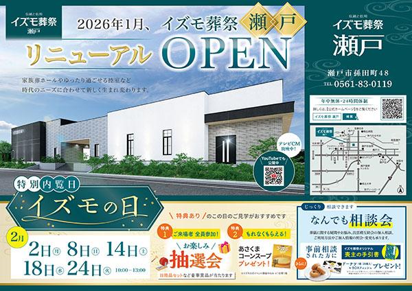 イズモ葬祭 瀬戸は、1月23日(金)に敷地内に新築立て替えでリニューアルオープンいたしました。2月は特別に、全ての友引にイズモの日特別内覧会を開催いたします。