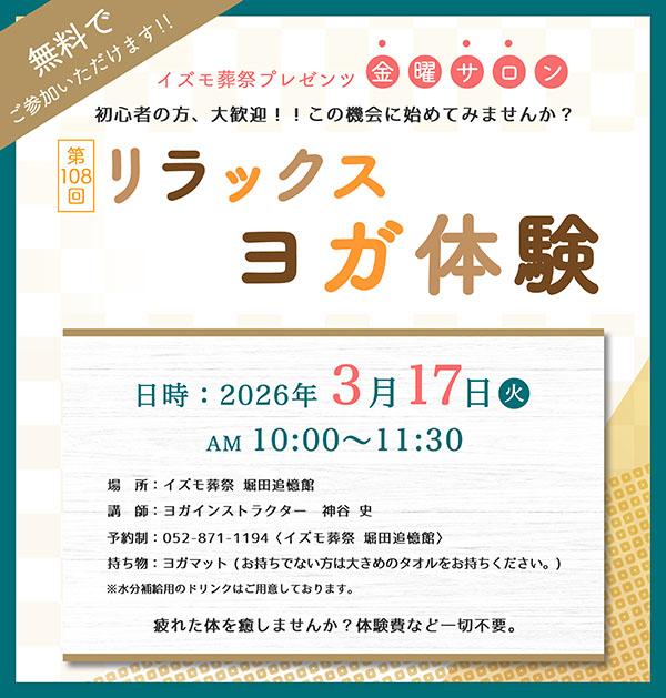 3/17(火) 家族葬ホール イズモ葬祭 堀田追憶館『リラックスヨガ体験』開催のご案内